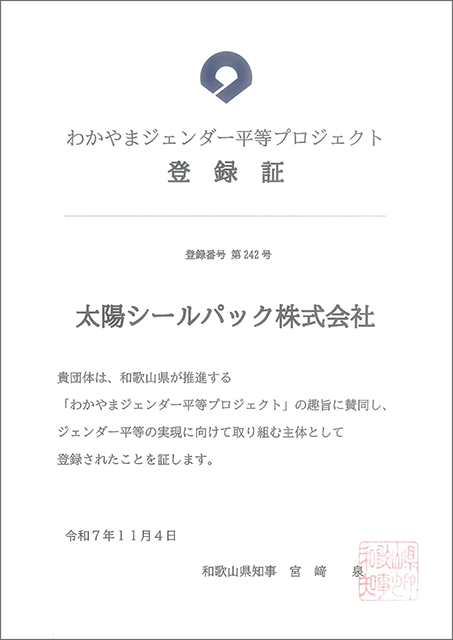 当社は、和歌山県が推進する「わかやまジェンダー平等プロジェクト」に、令和7年(2025年)11月4日付で登録いたしました。